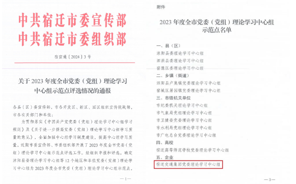 日前,市委宣傳部、市委組織部印發(fā)《關(guān)于2023年度全市黨委(黨組)理論學(xué)習(xí)中心組示范點(diǎn)評(píng)選情況的通報(bào)》,宿遷交通集團(tuán)黨委理論學(xué)習(xí)中心組獲評(píng)2023年度全市黨委(黨組)理論學(xué)習(xí)中心組示范點(diǎn)。這也是全市唯一一家企業(yè)獲此殊榮。