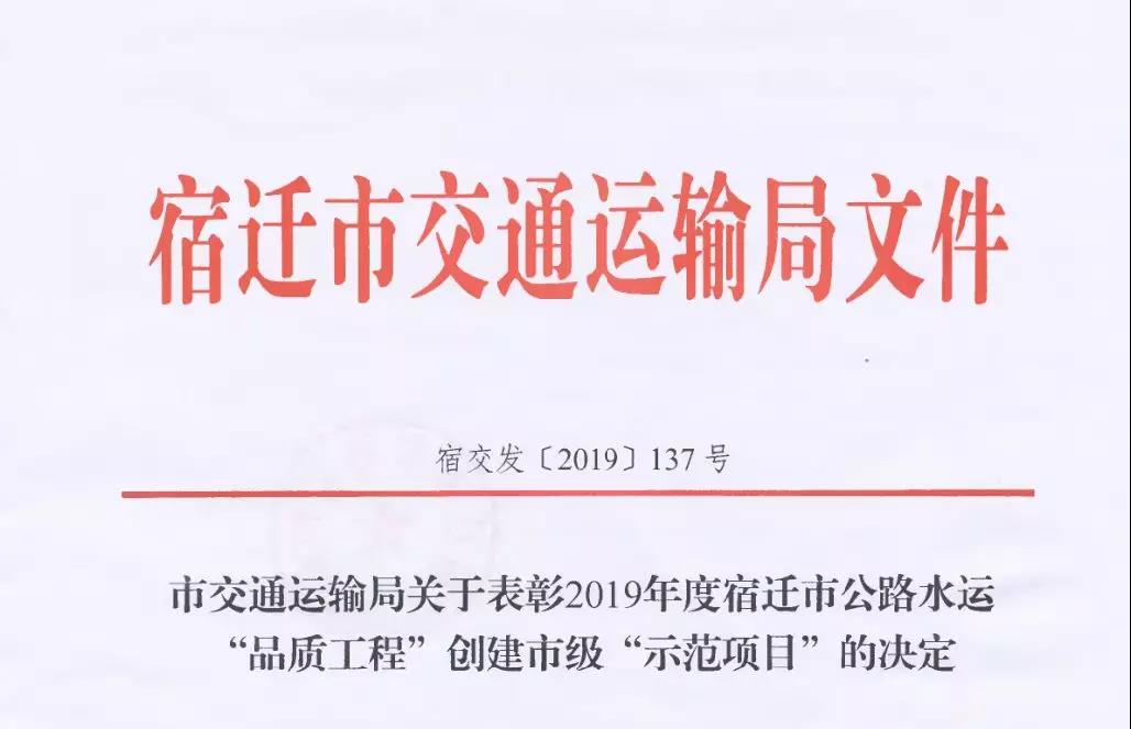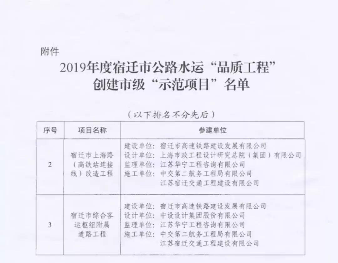 10月16日,宿遷市交通運輸局下發(fā)關(guān)于表彰2019年度宿遷市公路水運 “ 品質(zhì)工程” 創(chuàng)建市級“ 示范項目”的決定,宿遷市高速鐵路建設(shè)發(fā)展有限公司(簡稱高鐵公司)承建的市上海路(高鐵站連接線)改造工程和綜合客運樞紐附屬道路工程“入選”。