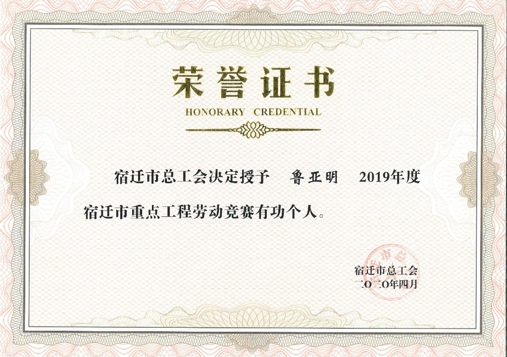 日前,宿遷市職工建功立業(yè)勞動(dòng)競(jìng)賽組委會(huì)發(fā)布《關(guān)于授予2019年度宿遷市勞動(dòng)和技能競(jìng)賽有功集體、有功個(gè)人和宿遷市技術(shù)能手的決定》,宿遷交建西湖西路(世紀(jì)大道—通湖大道段)改造工程施工項(xiàng)目部榮獲“市重點(diǎn)工程勞動(dòng)競(jìng)賽有功集體”稱號(hào),項(xiàng)目經(jīng)理魯亞明榮獲“市重點(diǎn)工程勞動(dòng)競(jìng)賽有功個(gè)人”稱號(hào)。