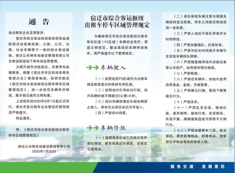 宿遷市綜合客運(yùn)樞紐正式啟用以來,為市民出行提供了極大便利。隨著高鐵線路班次的不斷優(yōu)化,乘車人數(shù)不斷增多,出租車用車需求攀升,對(duì)優(yōu)化該樞紐地下停車場(chǎng)停車管理水平提出了更高要求。為著力提升文明形象,結(jié)合場(chǎng)內(nèi)出租車停車區(qū)域(P3區(qū)域)運(yùn)營管理實(shí)際情況,根據(jù)《宿遷市市區(qū)機(jī)動(dòng)車停車管理辦法》等規(guī)章制度,宿遷停車場(chǎng)公司升級(jí)“宿遷好停車”品牌運(yùn)營管理服務(wù),研究制定《宿遷市綜合客運(yùn)樞紐出租車停車區(qū)域管理規(guī)定》(以下簡(jiǎn)稱《規(guī)定》),并于2020年8月1日起正式施行。