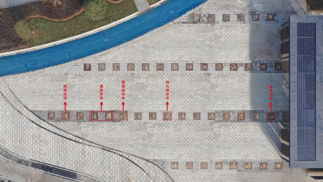 玖酒飄香浮雕整體采用99個(gè)“酒”字為設(shè)計(jì)元素,以純銅打造的“酒”字鑲嵌在深色的帶狀石材中,一條條深色的石帶如同宿遷千年運(yùn)河之水,承載著繁盛的宿遷釀酒業(yè)。用最具代表的篆書、隸書、魏碑、行書、草書等字體撰寫,并嵌入地下,呈現(xiàn)出宿遷酒都“得天地靈氣之無(wú)窮,承千年歷史之芬芳”的獨(dú)特內(nèi)涵。