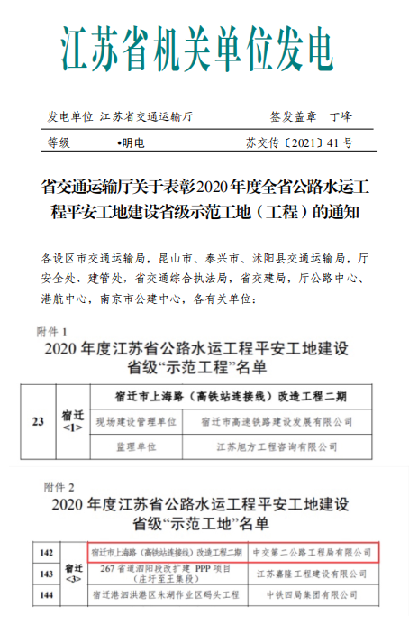 近日,江蘇省交通運(yùn)輸廳公布了2020年度全省公路水運(yùn)工程平安工地建設(shè)省級(jí)“示范工地(工程)”名單,由高鐵公司承建的上海路(高鐵站連接線)改造工程二期光榮上榜。至此,市綜合客運(yùn)樞紐工程、市高鐵商務(wù)區(qū)市政配套工程等該公司所有承建項(xiàng)目均獲得平安工地“示范工地”稱號(hào)。
