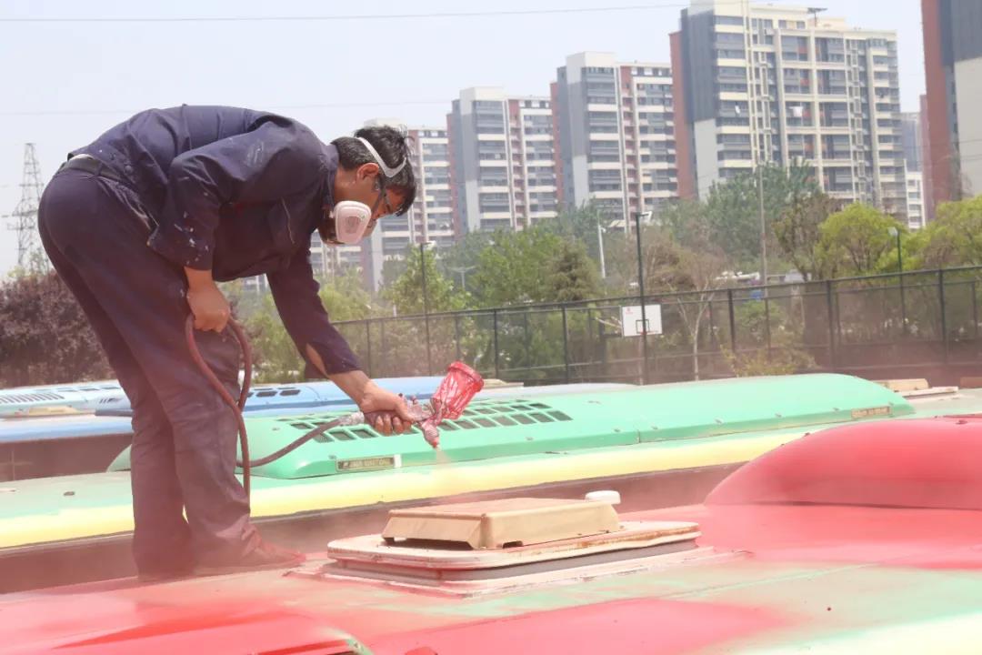 5月30日是星期日,上午10時,太陽炙烤著大地。在公交公司修理廠院內(nèi)的空地上,七八輛公交車露天停放。在公交車頂部,油漆工戴著防毒面具,穿著“五彩斑斕”的工作服,在熟練地進行噴漆作業(yè)。
