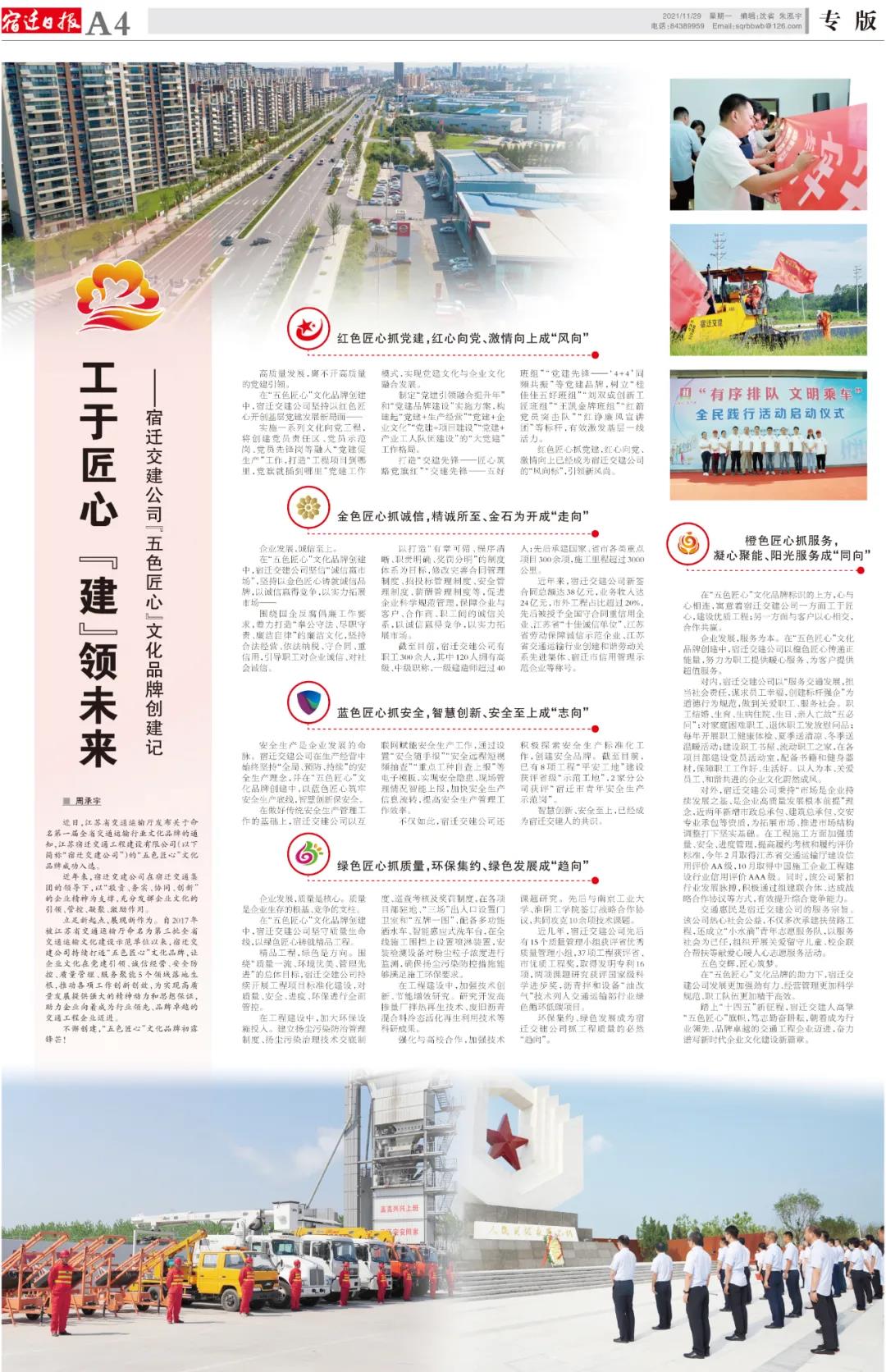 11月29日,《宿遷日?qǐng)?bào)》以《工于匠心 “建”領(lǐng)未來——宿遷交建公司“五色匠心”文化品牌創(chuàng)建記》為題專版報(bào)道了宿遷交建公司成功入選第一屆全省交通運(yùn)輸行業(yè)文化品牌的創(chuàng)新舉措和經(jīng)驗(yàn)做法。全文報(bào)道如下。