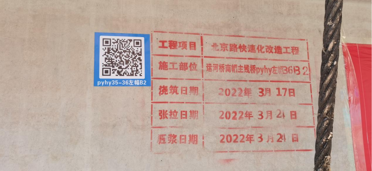 據(jù)悉,北京路運(yùn)河橋河?xùn)|南幅引橋?yàn)槠呗?lián)簡(jiǎn)支小箱梁,共11跨,每跨9片梁共99片。此次首片架設(shè)箱梁為28.9米小箱梁,最大自重約101噸,采用200噸架橋機(jī)安裝。在首片預(yù)制梁上,有噴印的編號(hào)等信息,還貼有專屬的二維碼,只需用手機(jī)掃碼,即可顯示出制梁位置、澆筑日期、設(shè)計(jì)方量等信息,就像每個(gè)人的身份證信息一樣,這樣不僅有助于快速準(zhǔn)確地定位,也有助于后期需要時(shí)進(jìn)行追溯查詢。