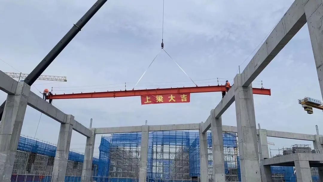 【通湖物流園】“鋼”立天地,“構(gòu)”筑未來,江蘇通湖物流園二期工程屋面首根鋼梁吊裝完成
