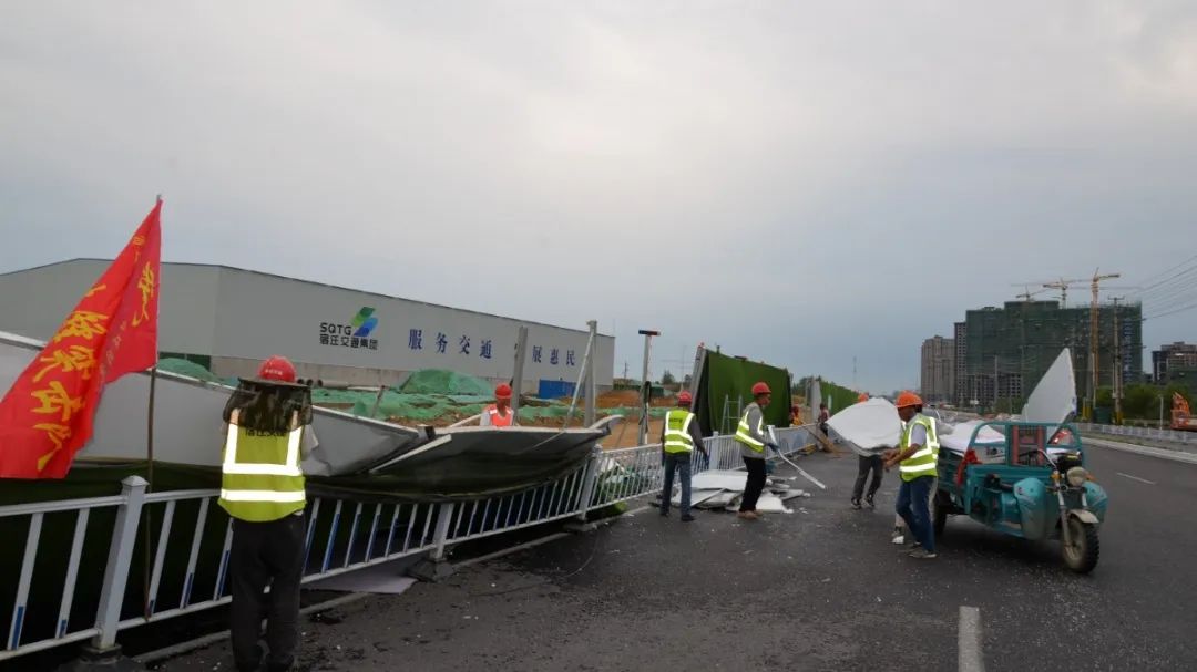 在狂風和暴雨的雙重襲擊下,現場的圍擋出現了部分倒伏損毀的情況,面對現場的情況,宿遷交建工程項目黨支部迅速組織“紅箭突擊隊”第一時間趕往現場,全體黨員顧不上圍擋上鋒利的邊角和突出的螺釘,抓緊時間對損壞處進行清理和維護,及時消除道路安全隱患,確?,F場道路交通通暢。