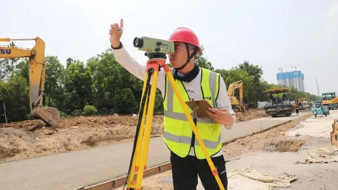 在迎賓大道二期快速化改造工程施工現(xiàn)場,機(jī)械轟鳴,施工人員在高溫下?lián)]灑汗水,緊鑼密鼓地進(jìn)行水穩(wěn)攤鋪。施工場地沒有一絲陰涼,豆大的汗珠順著曬紅的臉頰淌了下來,但技術(shù)人員依然巋然不動,他深知測量工作差之毫厘,謬以千里。