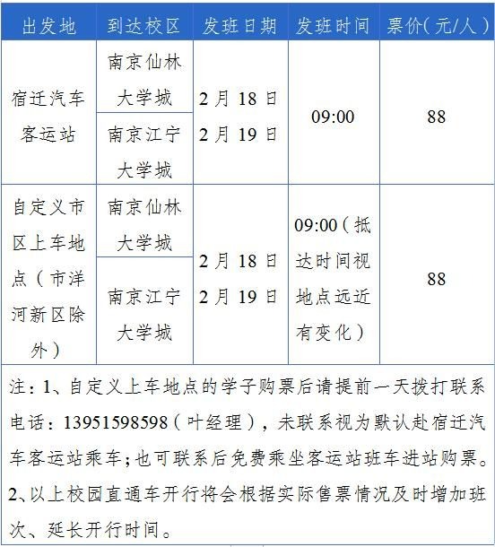購票后可自行前往宿遷汽車客運(yùn)站,想要自定義市區(qū)范圍內(nèi)乘車地點(diǎn)(市洋河新區(qū)不在范圍內(nèi))的同學(xué),網(wǎng)上購票后請(qǐng)?zhí)崆耙惶鞊艽?3951598598聯(lián)系自定義乘坐地點(diǎn),車輛免費(fèi)上門接送;如未購票也可提前聯(lián)系,客運(yùn)站派車接至站內(nèi)購票后乘車直達(dá)校園。