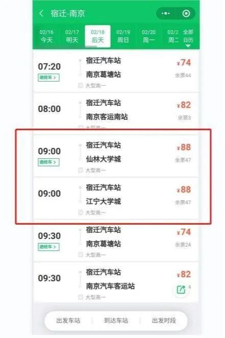 在微信或支付寶搜索“巴士管家”小程序,或掃碼下方“巴士管家”二維碼,選擇出發(fā)地“宿遷”,目的地“南京”,選擇出行日期,選中“仙林大學(xué)城”“江寧大學(xué)城”班次,即可進(jìn)行購票。