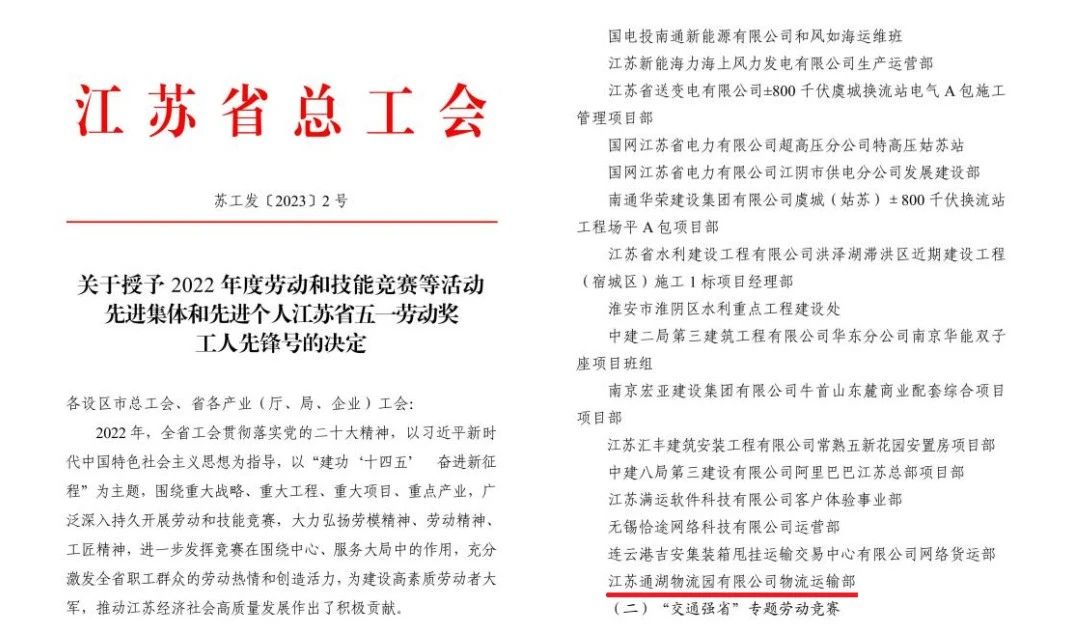 近日,江蘇省總工會公布了2022年省五一勞動獎、工人先鋒號名單,通湖物流園物流運輸部獲評“江蘇省工人先鋒號”。