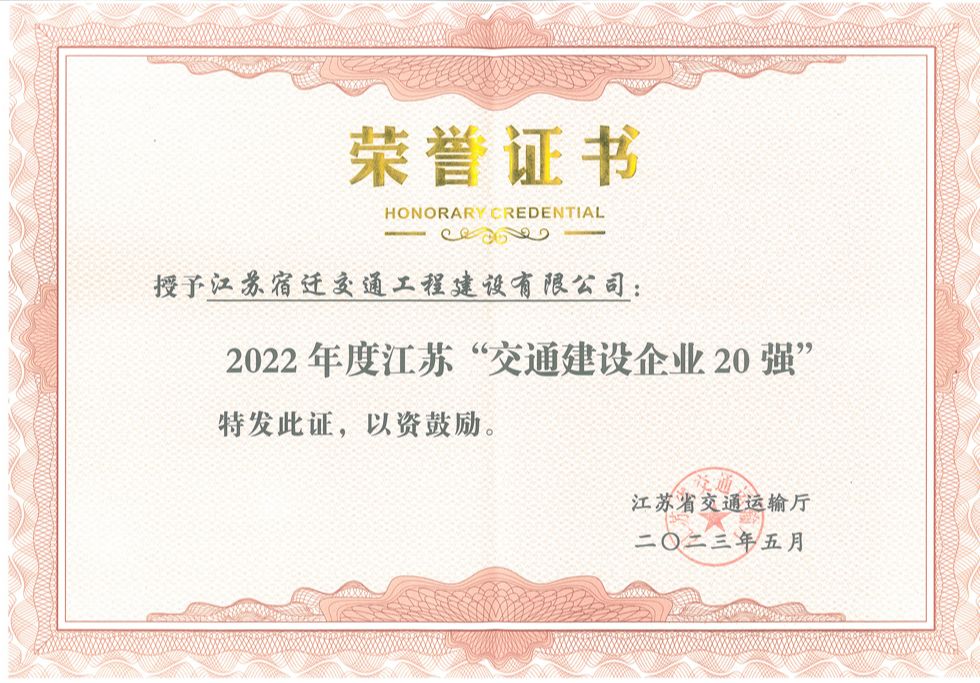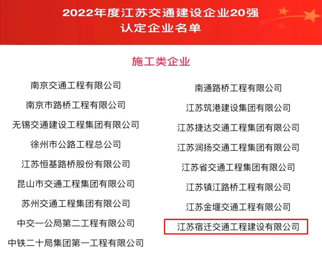 【宿遷交建】我市唯一!宿遷交建入選2022年度江蘇交通“建設(shè)企業(yè)20強(qiáng)”