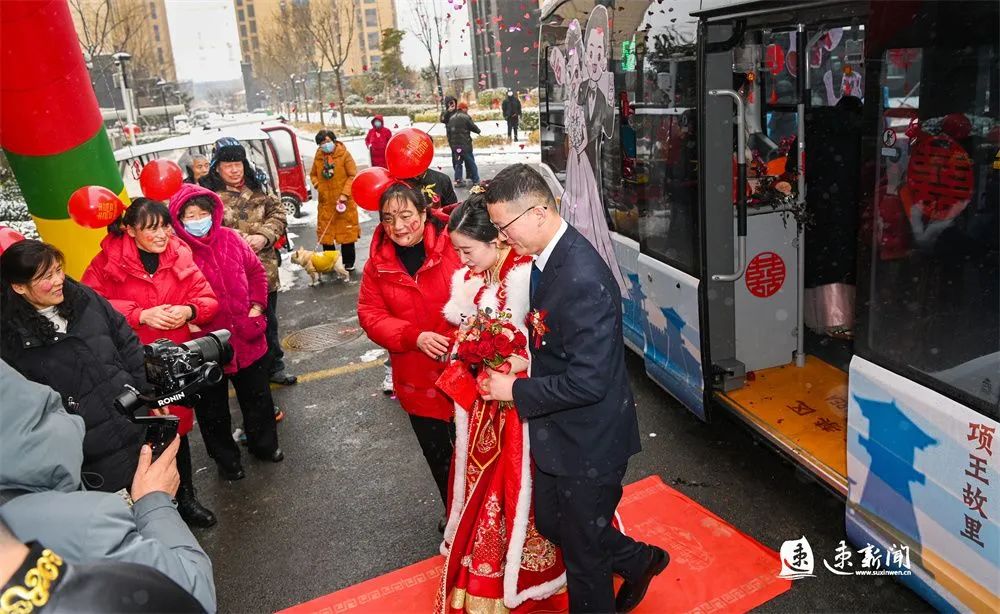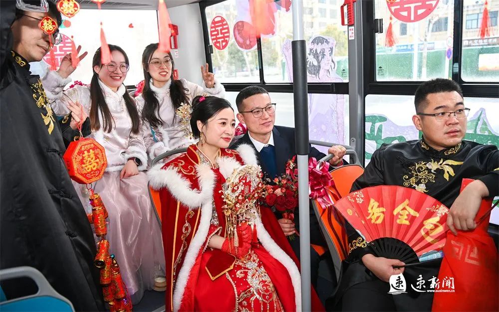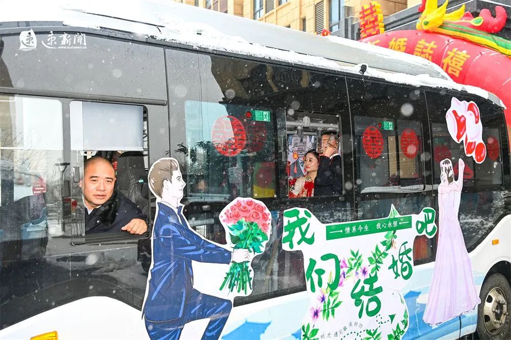 2月3日,在宿遷市區(qū)青華園小區(qū)附近,一輛精心裝飾鮮花、貼著大紅“囍”字的酒都小巴,惹人注目。在溫馨喜慶的車廂里,新郎、新娘跟大家合影、談笑,向著幸福美好的生活出發(fā)。