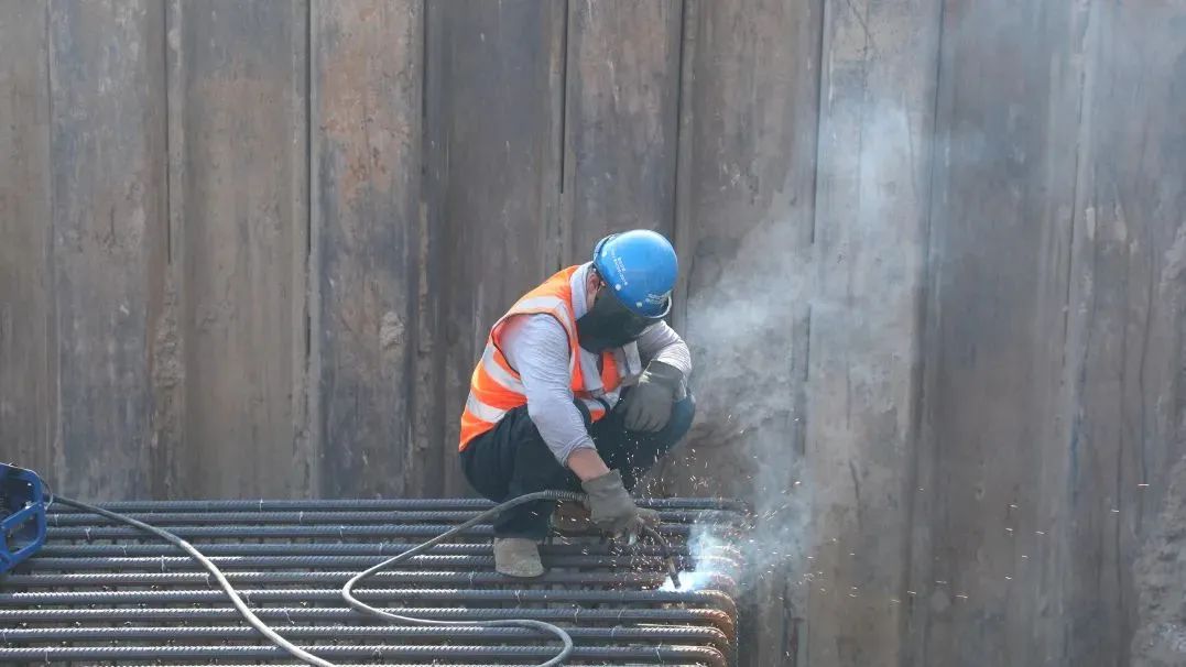 在宿遷大道項(xiàng)目現(xiàn)場(chǎng),電焊工穿著長(zhǎng)袖工作服、戴著勞保手套,只見(jiàn)他一手拿著焊槍,一手拿著防護(hù)面罩,正進(jìn)行承臺(tái)鋼筋焊接,電焊產(chǎn)生的火花飛揚(yáng)濺射。