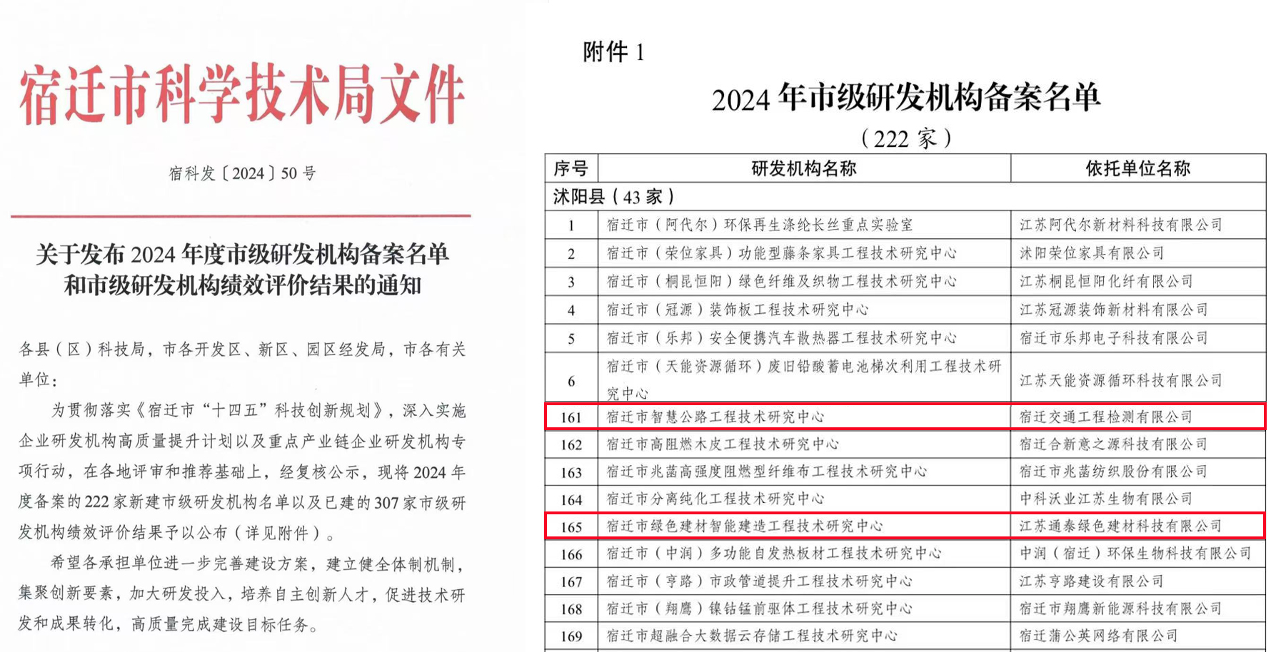 近日,宿遷市科學(xué)技術(shù)局發(fā)布通知,其中,宿遷交建所屬企業(yè)宿遷交通工程檢測有限公司申報的“宿遷市智慧公路工程技術(shù)研究中心”、江蘇通泰綠色建材科技有限公司申報的“宿遷市綠色建材智能建造工程技術(shù)研究中心”被認(rèn)定為市級研發(fā)機(jī)構(gòu)。