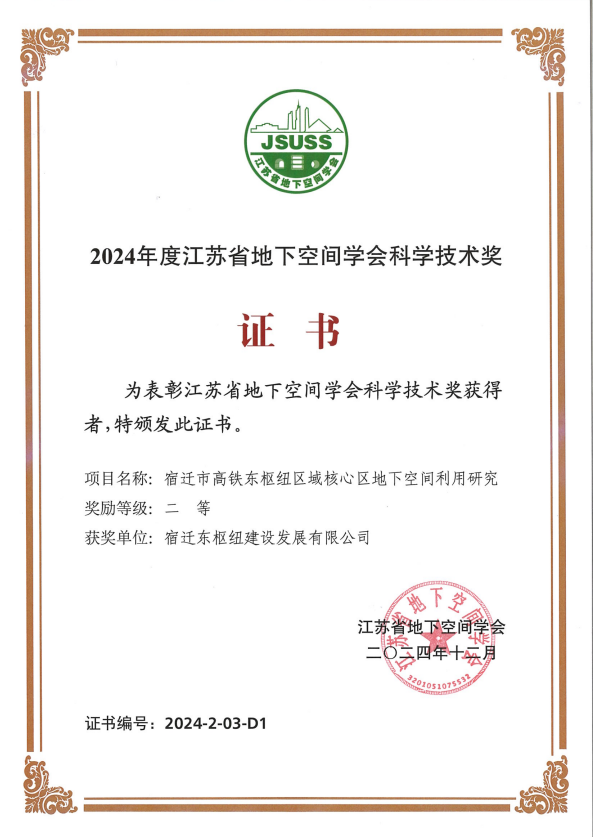 近日,江蘇省地下空間學會二屆二次理事會暨2024年度江蘇省地下空間學會科學技術(shù)獎頒獎表彰大會在南京召開,東樞紐公司的“宿遷市高鐵東樞紐區(qū)域核心區(qū)地下空間利用研究項目”榮獲二等獎。