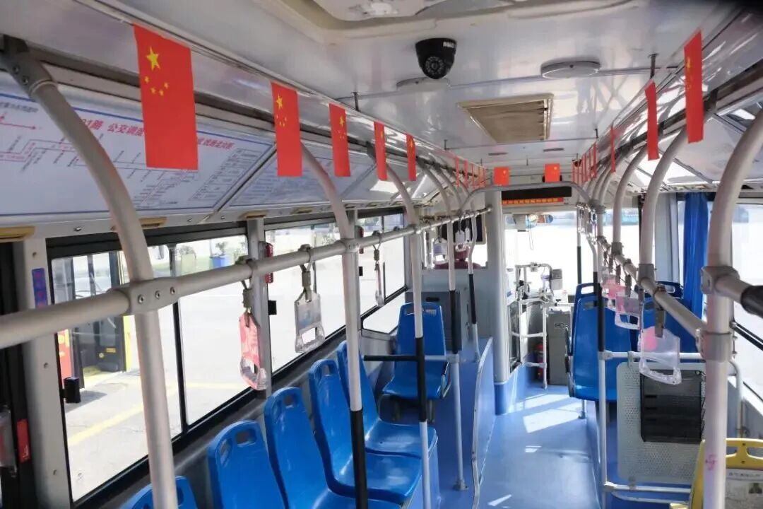 節(jié)日的車廂里,處處洋溢著濃厚的喜慶氛圍。301路公交車廂內(nèi),車頂兩側(cè)整齊懸掛著鮮艷的五星紅旗,微風(fēng)拂過,紅旗輕輕搖曳,乘客們剛踏上車廂,目光便被這抹亮眼的中國紅吸引,孩子們指著紅旗興奮地向家長提問,車廂內(nèi)滿是歡聲笑語,節(jié)日的幸福感在流動中不斷傳遞。
