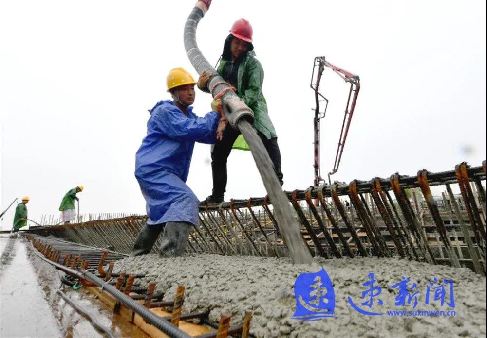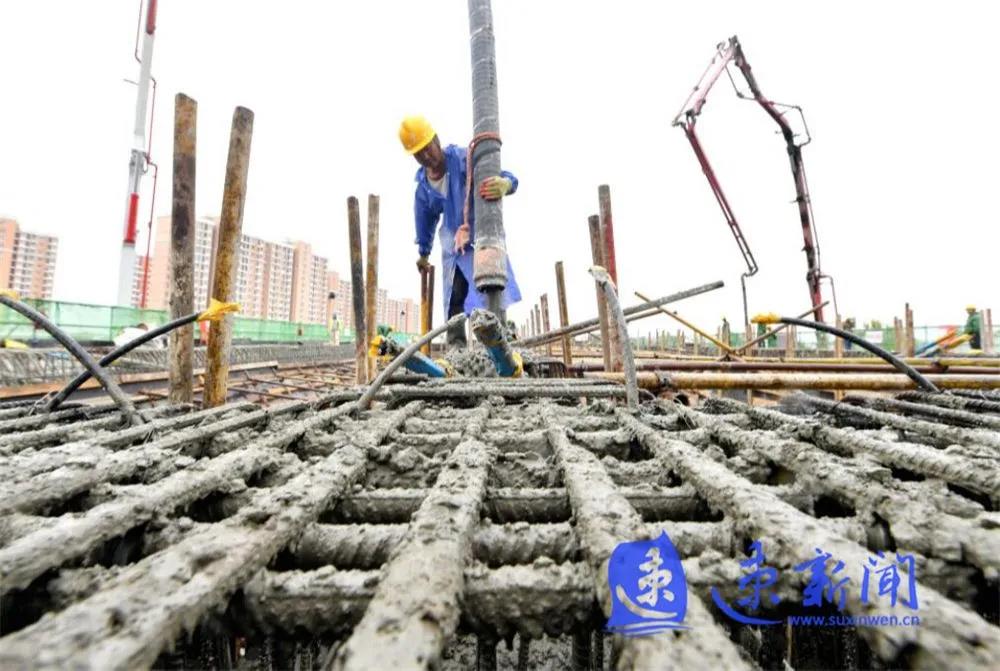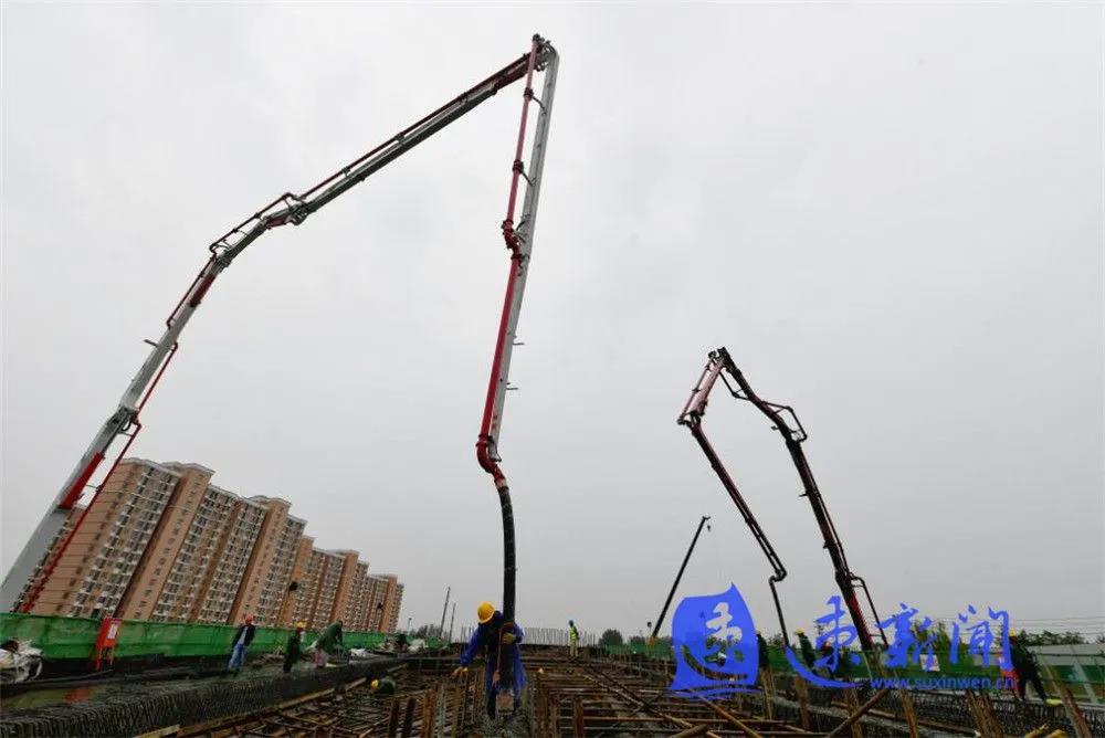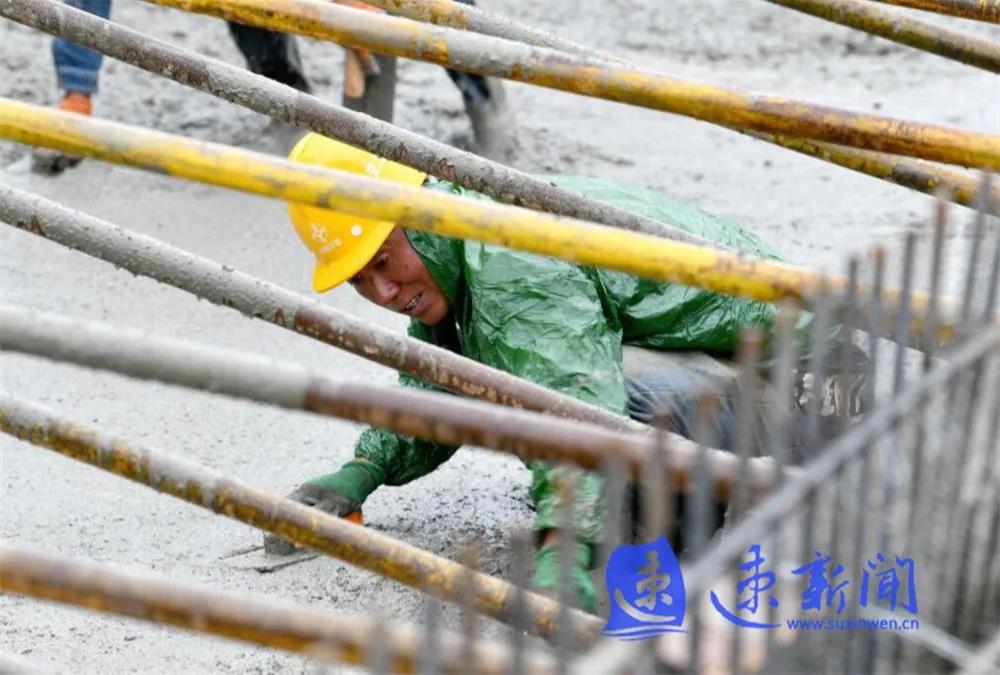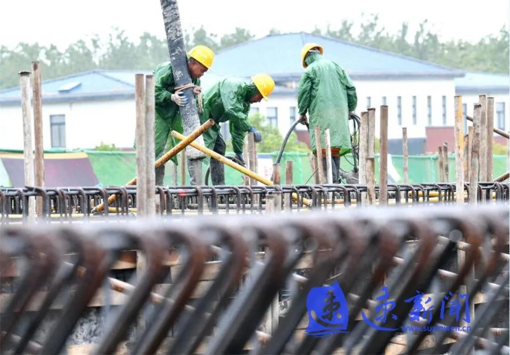 10月3日,宿遷市上海路(高鐵站連接線)改造二期工程項(xiàng)目工地工人正在雨中進(jìn)行施工作業(yè),混凝土澆筑、起重機(jī)運(yùn)轉(zhuǎn)、工程車往返,呈現(xiàn)出一派熱火朝天的勞動(dòng)場(chǎng)景。