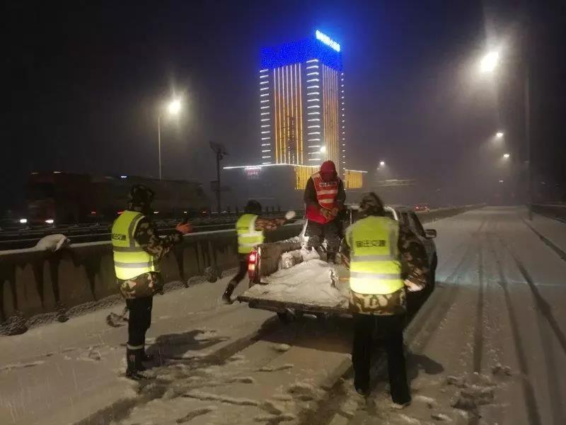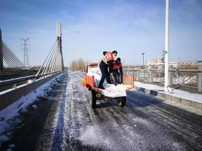 養(yǎng)護(hù)人員首先對道路、橋梁坡道、匝道、彎道等處撒上融雪劑、工業(yè)用鹽,再利用多臺除雪設(shè)備采用人機(jī)混合梯隊作業(yè)的形式進(jìn)行除雪鏟冰工作,確保三號橋、七號橋、發(fā)展大道橋等重點(diǎn)橋段全線車道無積雪、無結(jié)冰。截至16日凌晨2點(diǎn)左右,共出動養(yǎng)護(hù)人員70多名、裝載機(jī)4臺,投入運(yùn)輸車輛10臺,調(diào)集使用融雪劑40噸、工業(yè)鹽50噸。