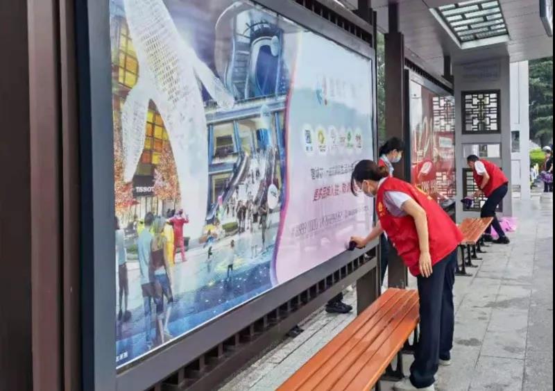 活動(dòng)中,黨員志愿者們統(tǒng)一穿戴志愿服務(wù)馬甲,拿著抹布、水桶、掃帚等工具對(duì)洪澤湖路段公交候車亭、電子站牌、公益畫面、凳子及周邊環(huán)境進(jìn)行清理,更換新的公益畫面幅。經(jīng)過(guò)半天的清理打掃,公交候車亭的活動(dòng)區(qū)域煥然一新。