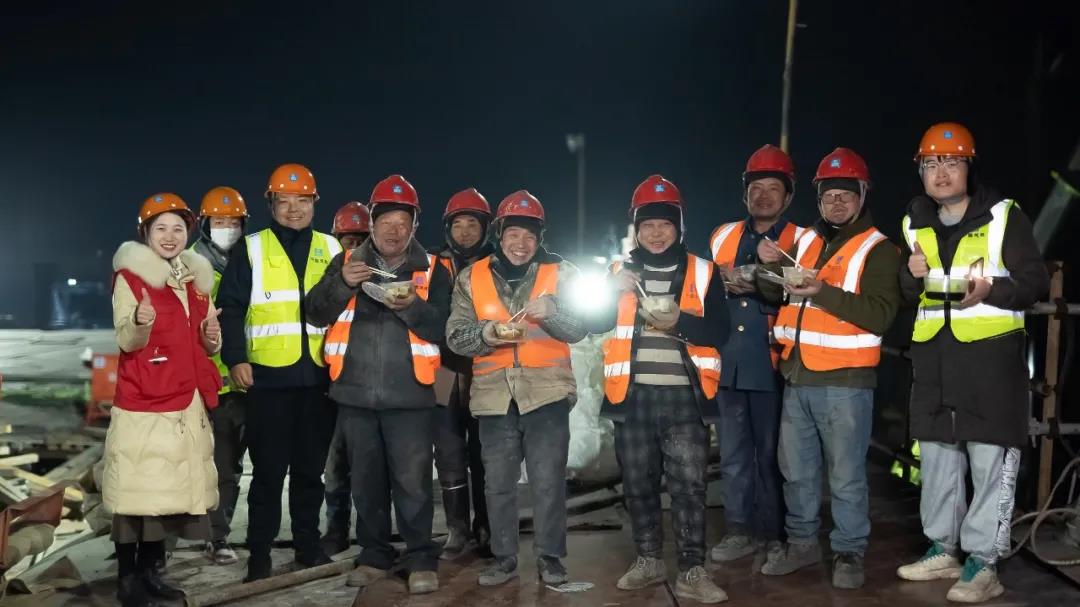 晚上組織志愿者為施工人員送上熱燙的湯圓、餃子,驅(qū)散冬季的寒冷。