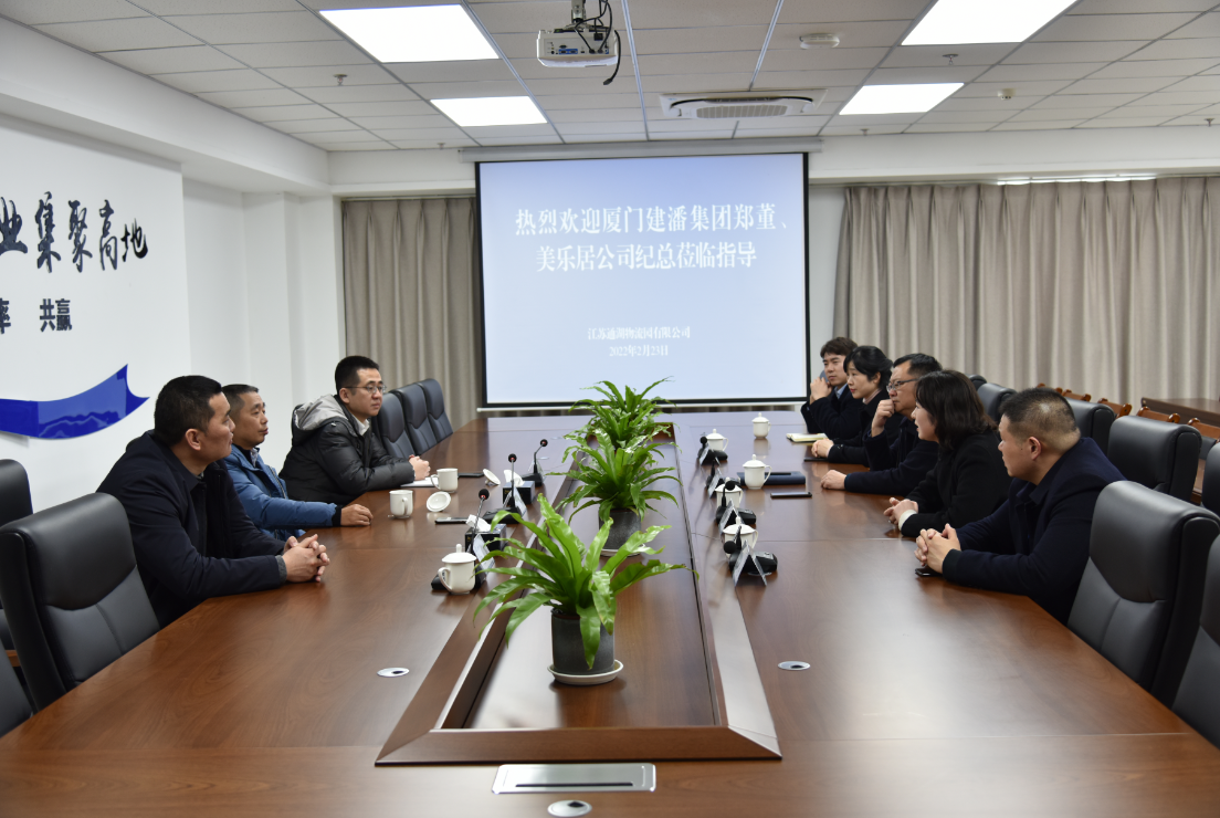 2月23日,廈門市建潘集團有限公司董事鄭峰、廈門美樂居商貿(mào)有限公司總經(jīng)理紀海峰一行蒞臨通湖物流園實地考察交流。集團黨委副書記周斌陪同考察。
