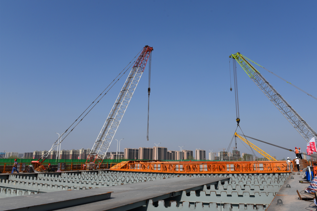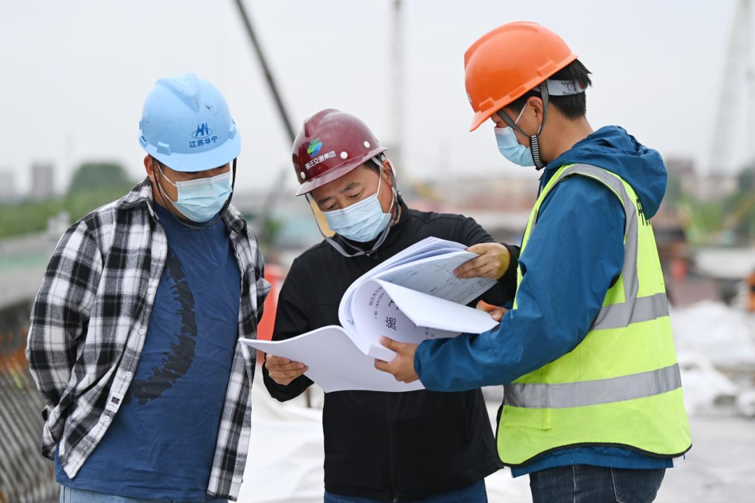 機(jī)器轟鳴、鋼架林立、塔吊聳立,5月1日,在北京路快速化改造工程跨京杭運(yùn)河特大橋施工現(xiàn)場,建設(shè)工人戴著口罩不停穿梭于道路開挖、管道鋪設(shè)、橋梁架構(gòu)等各個作業(yè)面,北京路快速化改造工程項目管理組組長朱寶廣與技術(shù)員認(rèn)真核對圖紙,反復(fù)商討下一階段施工方案。