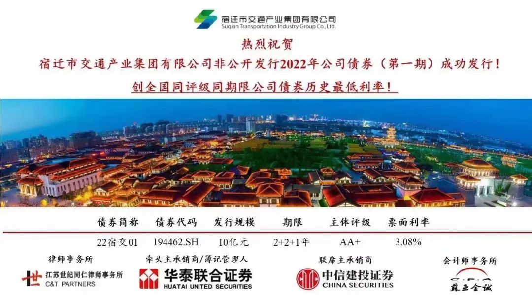 【喜訊】創(chuàng)全國(guó)最低!宿遷交通集團(tuán)非公開發(fā)行2022年公司債券(第一期)成功發(fā)行