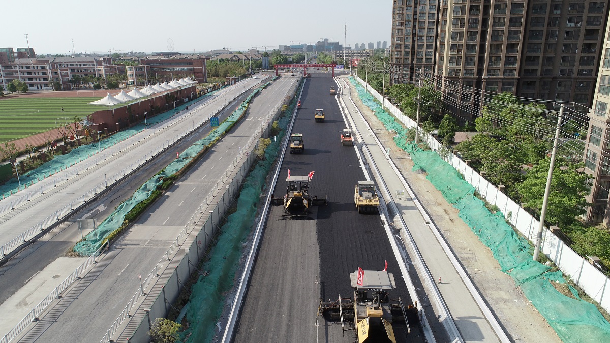 5月23日,在迎賓大道二期快速化改造工程2標(biāo)段施工現(xiàn)場,攤鋪機(jī)轟鳴,建設(shè)者揮汗如雨地忙著瀝青中面層施工。