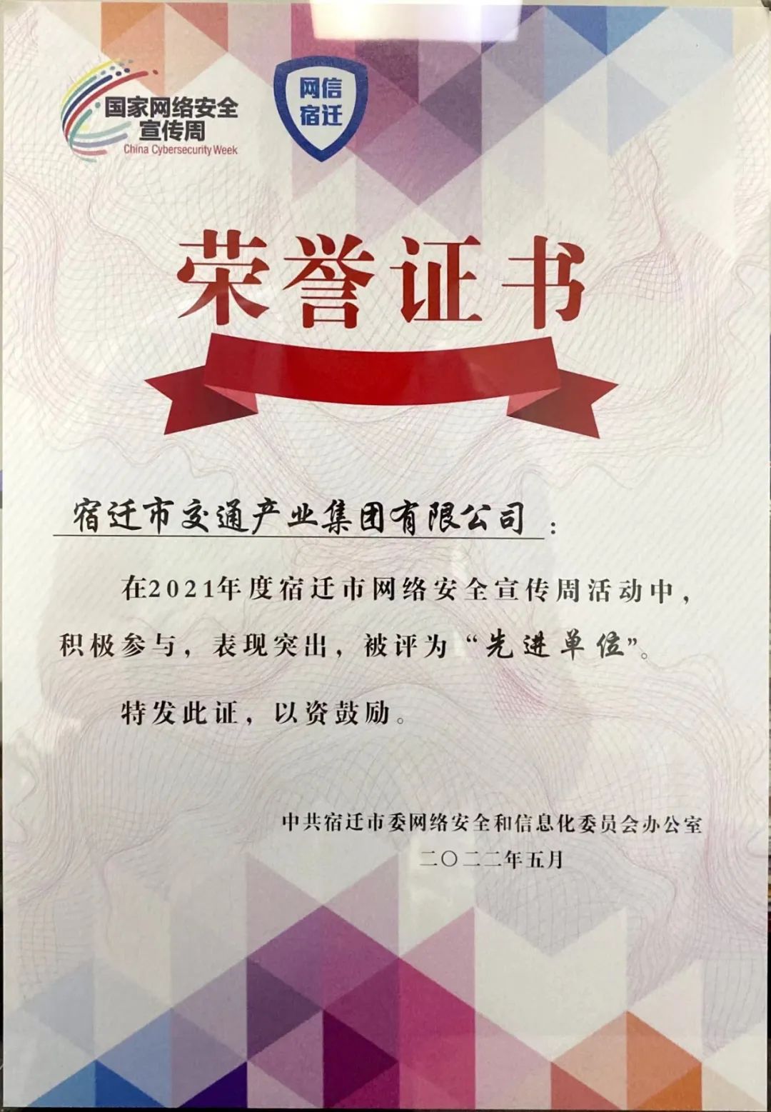 5月24日,從宿遷市網(wǎng)絡(luò)安全工作推進(jìn)會(huì)上獲悉,集團(tuán)榮獲2021年度宿遷市網(wǎng)絡(luò)安全宣傳周活動(dòng)先進(jìn)單位。