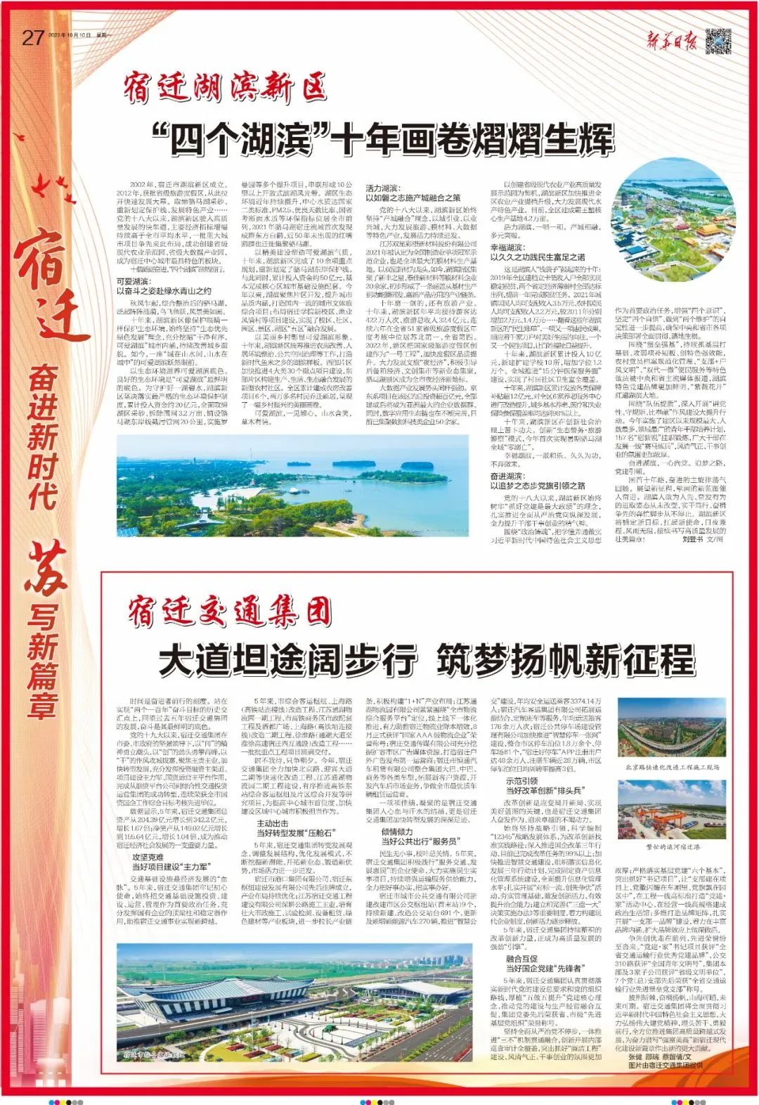10月10日,《新華日?qǐng)?bào)》以《宿遷交通集團(tuán):大道坦途闊步行 筑夢(mèng)揚(yáng)帆新征程》為題,報(bào)道了集團(tuán)過去五年從融資平臺(tái)公司到綜合性交通投資運(yùn)營(yíng)集團(tuán)成功轉(zhuǎn)型的發(fā)展歷程。