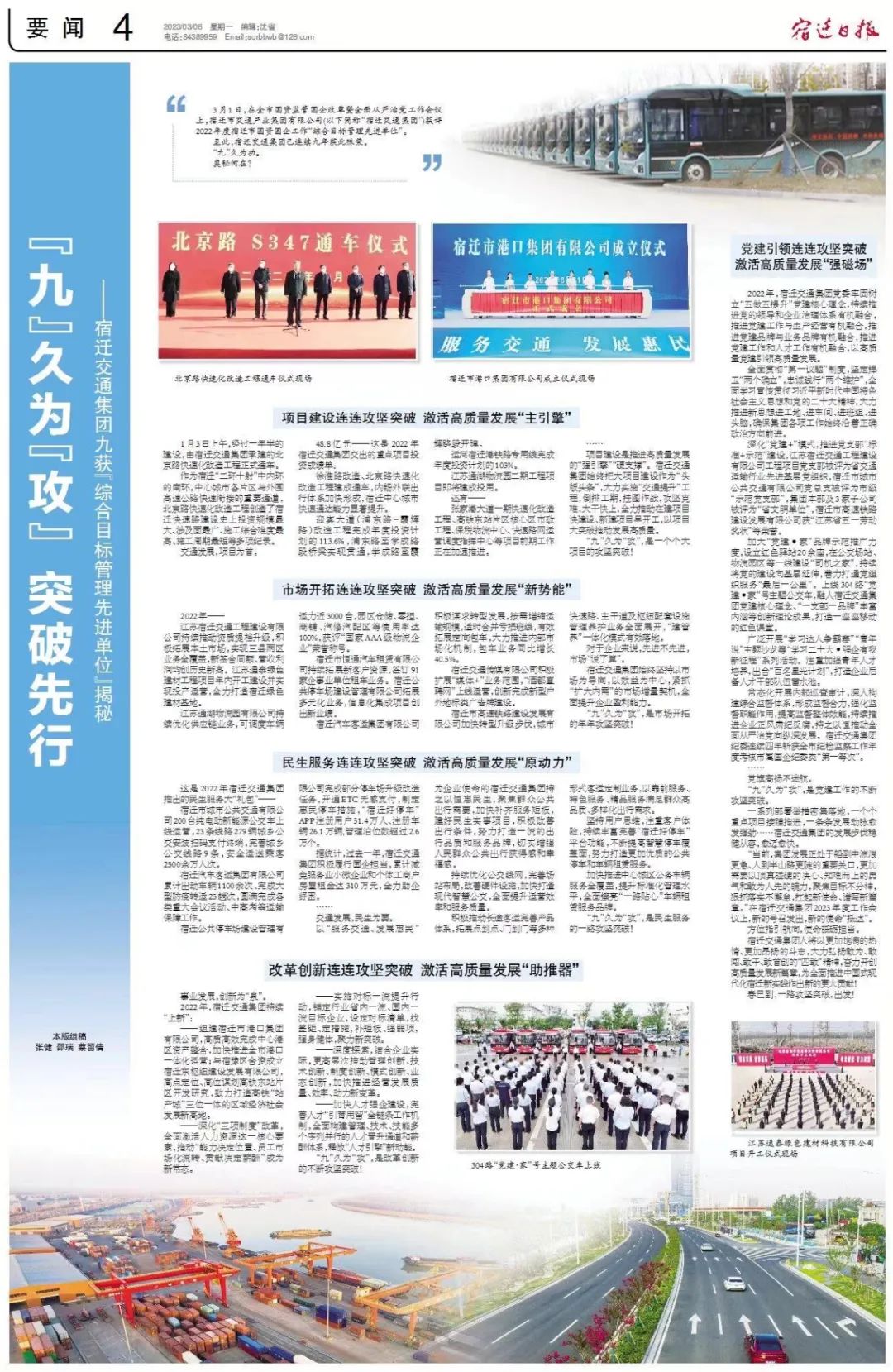 加大“黨建·家”品牌示范推廣力度,設(shè)立紅色驛站20余座,在公交場(chǎng)站、物流園區(qū)等一線建設(shè)“司機(jī)之家”,持續(xù)將黨的建設(shè)向基層延伸,著力打通黨組織服務(wù)“最后一公里”。上線304路“黨建·家”號(hào)主題公交車,融入宿遷交通集團(tuán)黨建核心理念、“一支部一品牌”豐富內(nèi)涵等創(chuàng)新理論成果,打造一座座移動(dòng)的紅色課堂。 廣泛開展“學(xué)習(xí)達(dá)人爭(zhēng)霸賽”“青年說(shuō)”主題沙龍等“學(xué)習(xí)黨的二十大·強(qiáng)企有我新征程”系列活動(dòng)。注重加強(qiáng)青年人才培養(yǎng),實(shí)施“百名星光計(jì)劃”,打造企業(yè)后備人才干部隊(duì)伍“蓄水池”。 常態(tài)化開展內(nèi)部巡查審計(jì),深入構(gòu)建綜合監(jiān)督體系,形成監(jiān)督合力,強(qiáng)化監(jiān)督職能作用,提高監(jiān)督整體效能,持續(xù)推進(jìn)企業(yè)正風(fēng)肅紀(jì)反腐,持之以恒推動(dòng)全面從嚴(yán)治黨向縱深發(fā)展。宿遷交通集團(tuán)紀(jì)委連續(xù)四年獲得全市紀(jì)檢監(jiān)察工作年度考核市屬國(guó)企紀(jì)委類第一等次。 …… 黨旗高揚(yáng)不迷航。 “九”久為“攻”,是黨建工作的不斷攻堅(jiān)突破。 一系列部署舉措密集落地,一個(gè)個(gè)重點(diǎn)項(xiàng)目接續(xù)推進(jìn),一條條發(fā)展動(dòng)脈愈發(fā)強(qiáng)勁……宿遷交通集團(tuán)的發(fā)展步伐穩(wěn)健從容,愈邁愈快。 “當(dāng)前,集團(tuán)發(fā)展正處于船到中流浪更急、人到半山路更陡的重要關(guān)口,更加需要以頂真碰硬的決心、知難而上的勇氣和敢為人先的魄力,聚焦目標(biāo)不分神、狠抓落實(shí)不懈怠,扛起新使命、譜寫新篇章。”在宿遷交通集團(tuán)2023年度工作會(huì)議上,新的號(hào)召發(fā)出,新的使命“抵達(dá)”。 目標(biāo)指引航向,使命砥礪擔(dān)當(dāng)。 宿遷交通集團(tuán)將以更加飽滿的熱情、更加昂揚(yáng)的斗志,大力弘揚(yáng)“四敢”精神,奮力開創(chuàng)高質(zhì)量發(fā)展新篇章,為全面推進(jìn)中國(guó)式現(xiàn)代化宿遷新實(shí)踐作出新的更大貢獻(xiàn)! 春已到,一路攻堅(jiān)突破,出發(fā)!