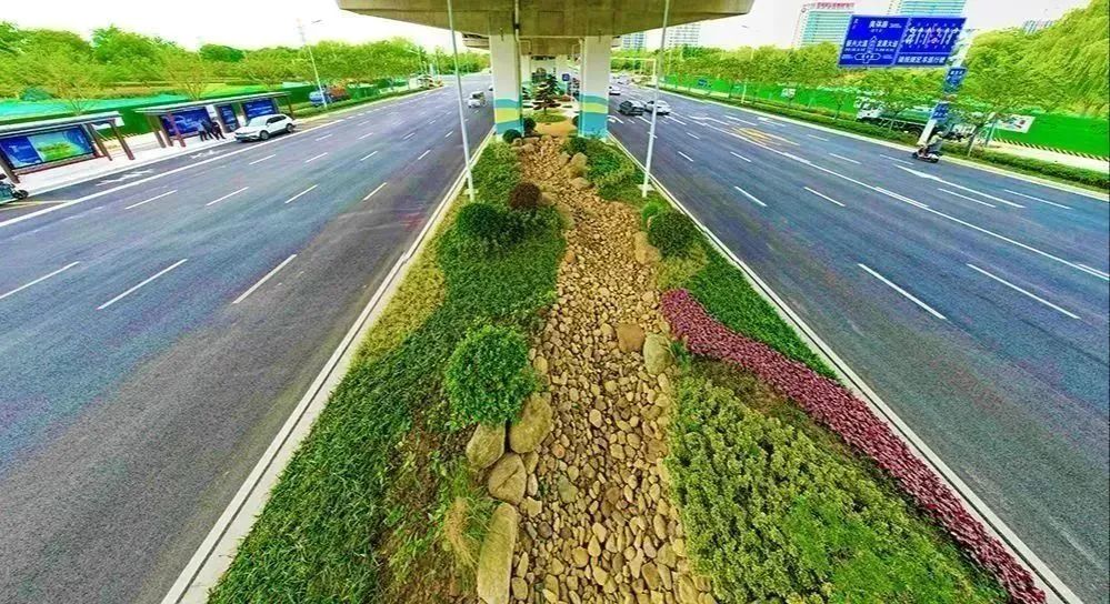 一步一景,已足以傾城。而迎賓大道二期快速化改造工程在景觀綠化施工中,還融入了海綿城市設(shè)計(jì)理念,在宿支路至濱河路、駱馬湖路至洪澤湖路、微山湖路至青海湖路,分別以山水、藍(lán)夢(mèng)、仙蹤為主題,用泰山石、藍(lán)色玻璃石、紅色玻璃石、灰白礫石及海綿旱溪、花境、造型羅漢松、灌木球等進(jìn)行巧妙搭配,實(shí)現(xiàn)景觀提升與“海綿城市”充分融合,打造流暢蜿蜒的綠色海綿線。