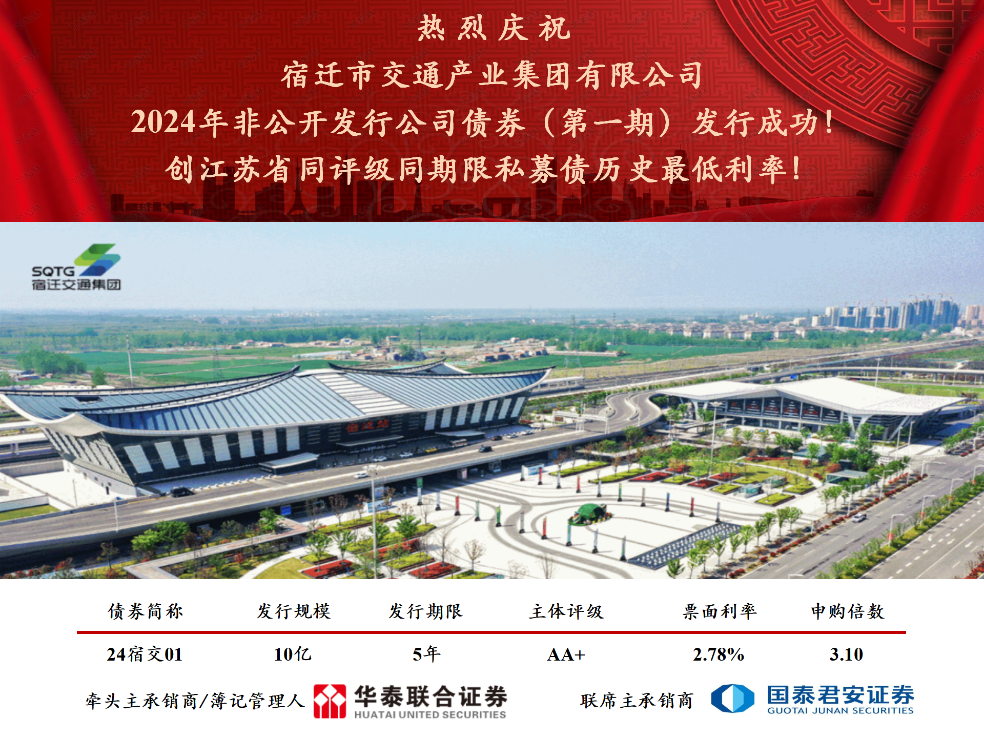 4月24日,宿遷交通集團(tuán)成功發(fā)行2024年非公開發(fā)行公司債券(第一期),發(fā)行規(guī)模10億元,期限5年,由華泰聯(lián)合證券、國(guó)泰君安證券聯(lián)合承銷,票面利率2.78%,創(chuàng)江蘇省同評(píng)級(jí)同期限私募債歷史最低利率。