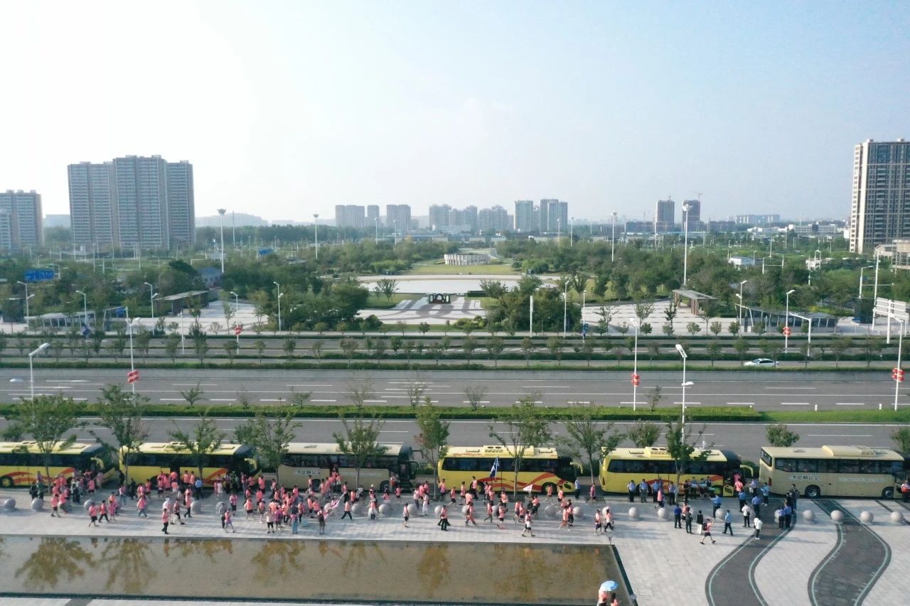 在這里,18輛由宿遷交通集團統(tǒng)籌調度的定制公交早已整裝待發(fā),志愿者們手持車輛編號牌在車旁引導。