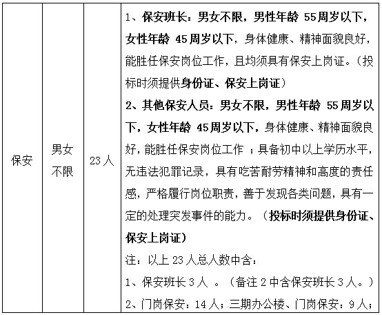 1.原采購文件 第四部分 采購需求 三、服務崗位人員配置、服務要求:保安人員要求更正為以下內容: