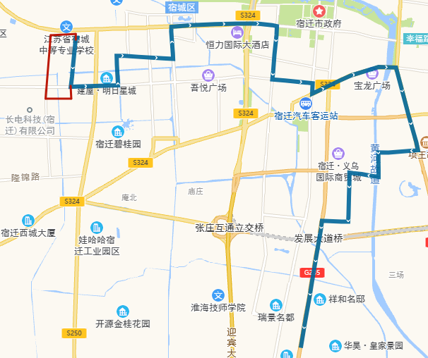 (四)318路。將現市第一人民醫(yī)院公交首末站—頤和路—濱河路—迎賓大道—洪澤湖路—世紀大道—青海湖路—平安大道—西湖路—發(fā)展大道—項王路—項王東路—珠江路—學海路—黃浦江路—洪澤湖東路—漢江路—項王東路—張家港大道—雪峰山路—楊舍路—梨園灣路段,優(yōu)化為市第一人民醫(yī)院公交首末站—宿支路—發(fā)展大道—洪澤湖路—青年路—西湖路—西湖東路—珠江路—黃山路—雪峰山路—楊舍路—梨園灣。