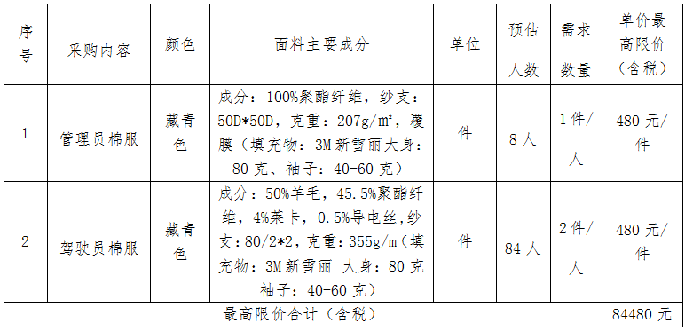 (一)主要內(nèi)容:本項(xiàng)目為宿遷市城市公共交通有限公司職工冬季服裝采購(gòu)項(xiàng)目。采購(gòu)內(nèi)容包括: